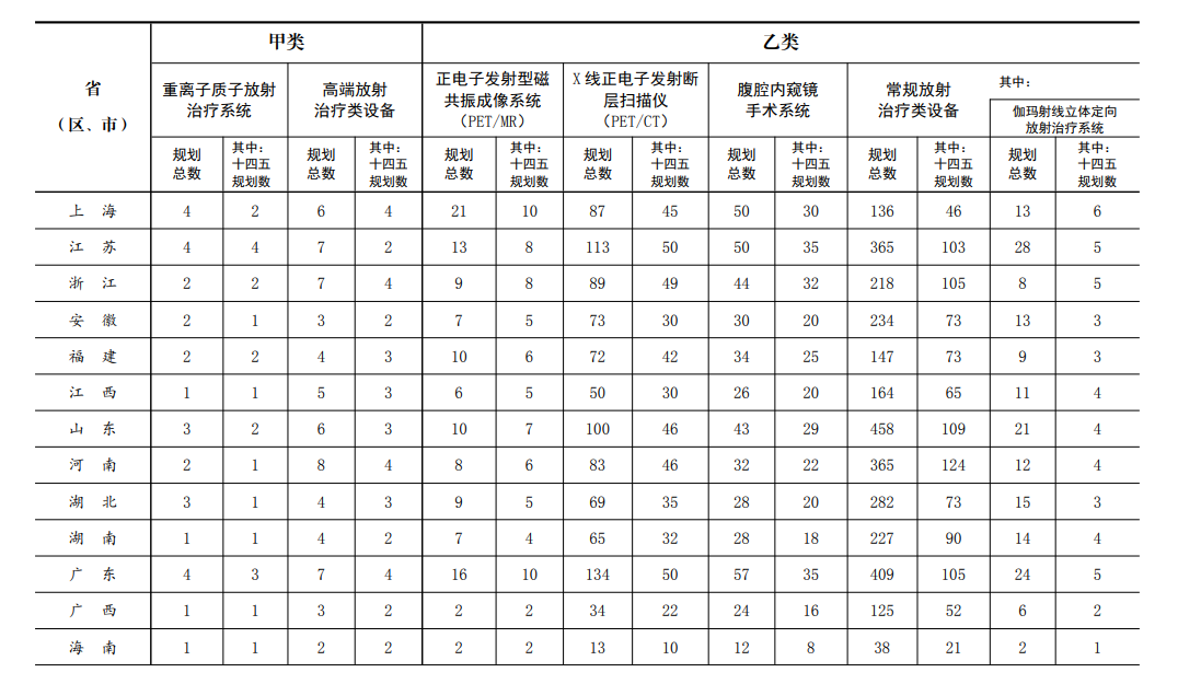 據此統(tǒng)計,到“十四五”結束,我國將擁有甲類設備合計185臺,其中重離子質子放射治療系統(tǒng)共60臺、高端放射治療類設備共125臺;乙類設備合計8029臺,其PET/MR共210臺、PET/CT共1667臺、腹腔內窺鏡手術系統(tǒng)共819臺、常規(guī)放射治療類設備共5333臺(伽馬射線立體定向放射治療系統(tǒng)共327臺)。
