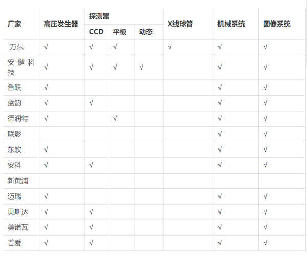 由此可見,國內DR廠家在高壓發生器、機械系統以及圖像系統等幾個方面都具備自主研發生產的能力,但在探測器、X線球管等核心部件上自主研發能力比較欠缺,目前僅有萬東和安健科技在這方面有技術儲備。