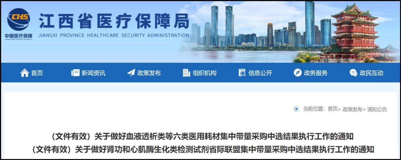 5月31日,江西醫保局發布《關于做好血液透析類等六類醫用耗材集中帶量采購中選結果執行工作的通知》《關于做好腎功和心肌酶生化類檢測試劑省際聯盟集中帶量采購中選結果執行工作的通知》。