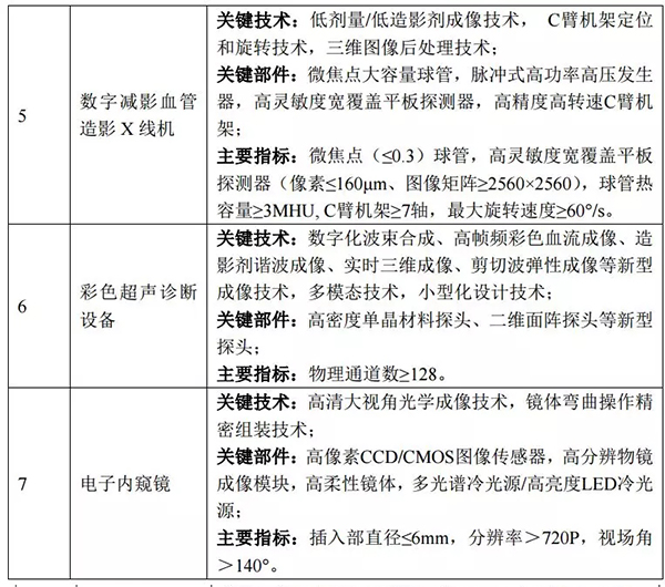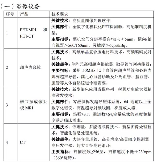 鼓勵(lì)國(guó)內(nèi)空白的 PET-MRI、超聲內(nèi)窺鏡等創(chuàng)新設(shè)備產(chǎn)業(yè)化。推動(dòng)具備一定基礎(chǔ)的 PET-CT、CT、MRI、彩色超聲診斷設(shè)備、電子內(nèi)窺鏡、數(shù)字減影血管造影 X 線(xiàn)機(jī)(DSA)等設(shè)備升級(jí)換代和質(zhì)量性能提升。加快大熱容量 X 射線(xiàn)球管、超導(dǎo)磁體、新型超聲探頭等核心部件及圖像處理軟件等核心技術(shù)的開(kāi)發(fā)。