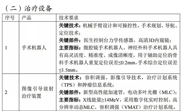 鼓勵(lì)國(guó)內(nèi)空白的腹腔鏡手術(shù)機(jī)器人、神經(jīng)外科手術(shù)機(jī)器人等創(chuàng)新設(shè)備產(chǎn)業(yè)化。推動(dòng)具備一定基礎(chǔ)的高能直線(xiàn)加速器及影像引導(dǎo)放射治療裝置、血液透析設(shè)備(含耗材)、治療用呼吸機(jī)、骨科手術(shù)機(jī)器人、智能康復(fù)輔助器具等產(chǎn)品的升級(jí)換代和質(zhì)量性能提升。