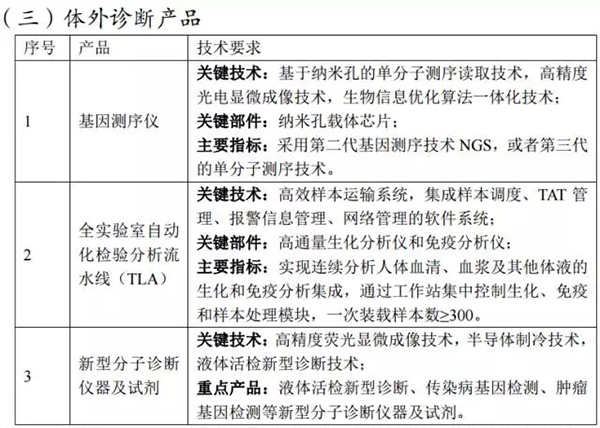 鼓勵(lì)國(guó)內(nèi)空白的全實(shí)驗(yàn)室自動(dòng)化檢驗(yàn)分析流水線(xiàn)(TLA)等創(chuàng)新設(shè)備產(chǎn)業(yè)化。推動(dòng)具備一定基礎(chǔ)的高通量基因測(cè)序儀、化學(xué)發(fā)光免疫分析儀、新型分子診斷儀器、即時(shí)檢驗(yàn)系統(tǒng)(POCT)等體外診斷產(chǎn)品及試劑升級(jí)換代和質(zhì)量性能提升。