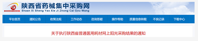 近日,陜西省藥械集中采購網發布《關于執行陜西省普通醫用耗材網上陽光采購結果的通知》(下稱《通知》)。