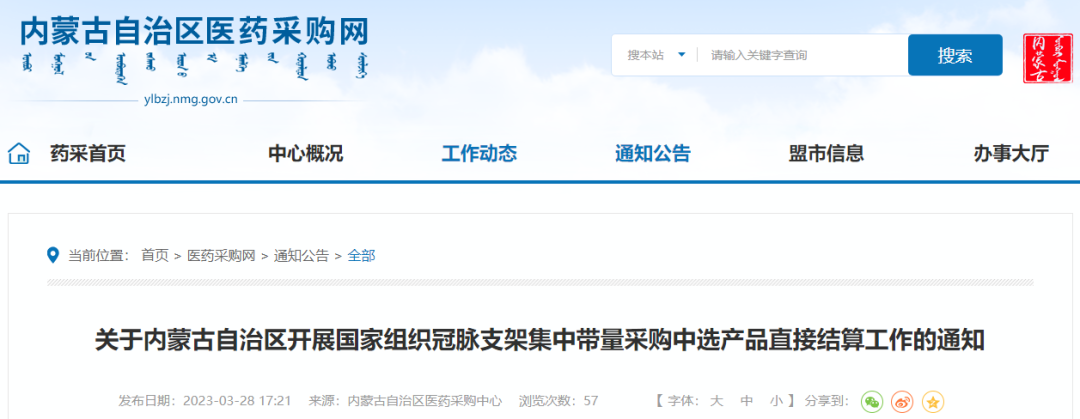 3月28日,內(nèi)蒙古自治區(qū)醫(yī)藥采購網(wǎng)發(fā)布《關(guān)于內(nèi)蒙古自治區(qū)開展國家組織冠脈支架集中帶量采購中選產(chǎn)品直接結(jié)算工作的通知》(以下簡稱《通知》)。