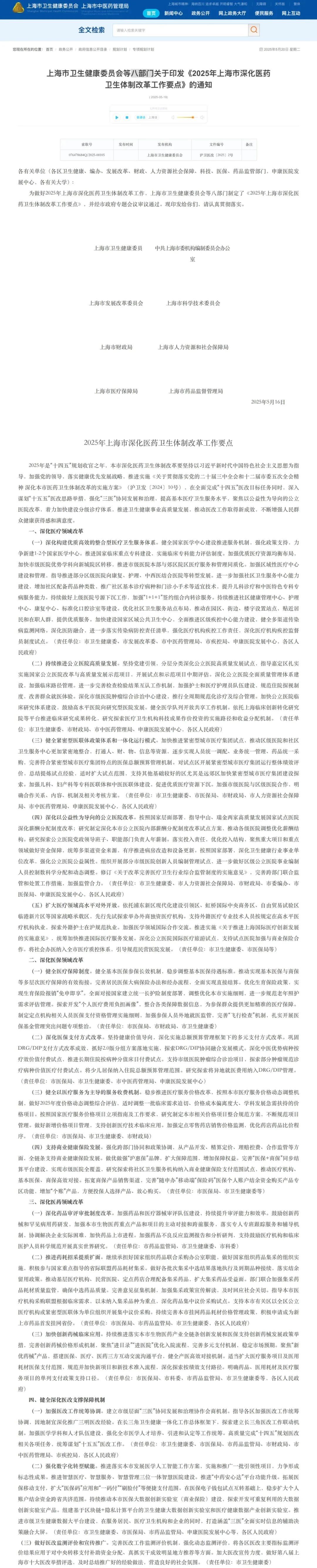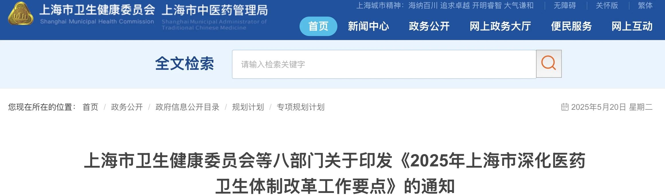 5月19日,上海衛健委等八部門印發《2025年上海市深化醫藥衛生體制改革工作要點》(簡稱《工作要點》)。