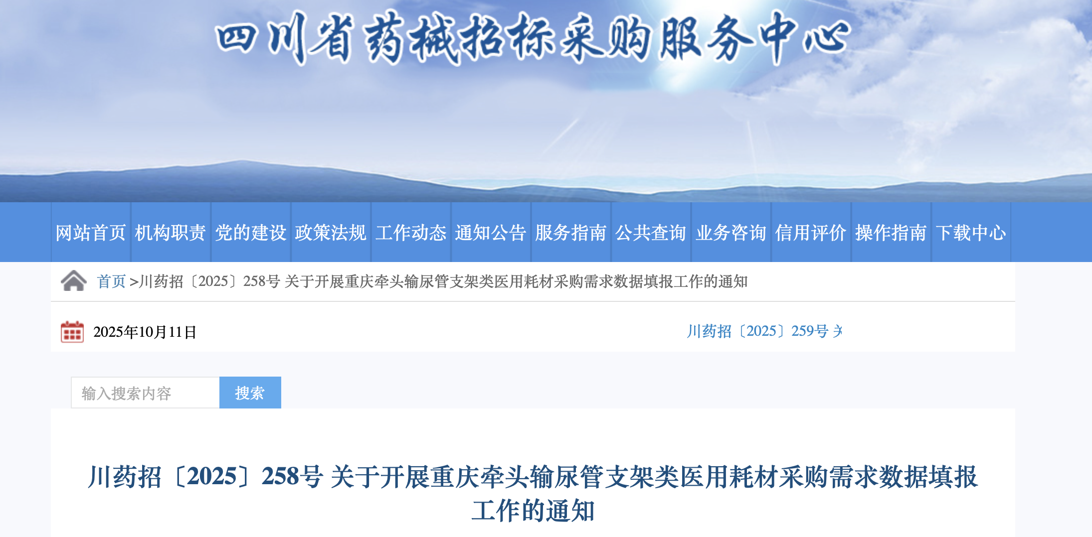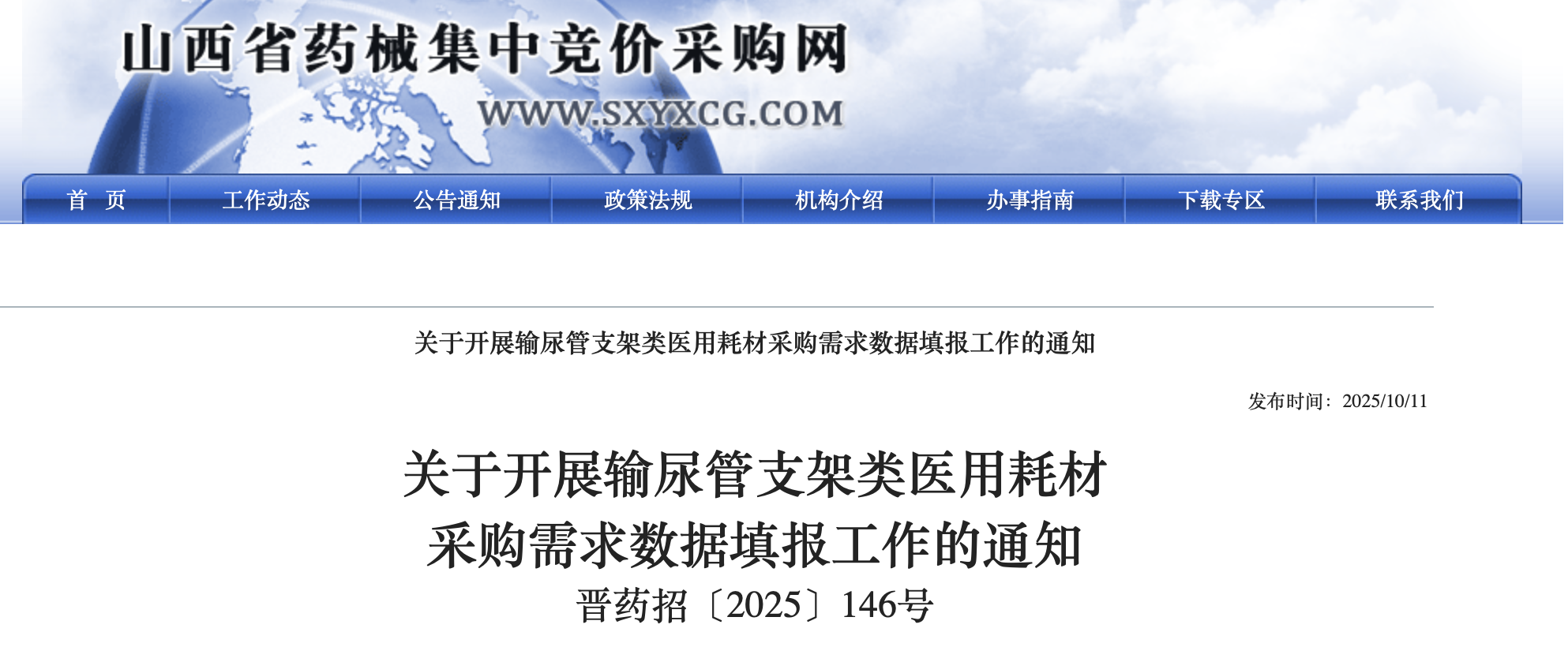 10月10日-10月11日,四川、山西等地發(fā)布開展輸尿管支架類醫(yī)用耗材采購需求數(shù)據(jù)填報工作。