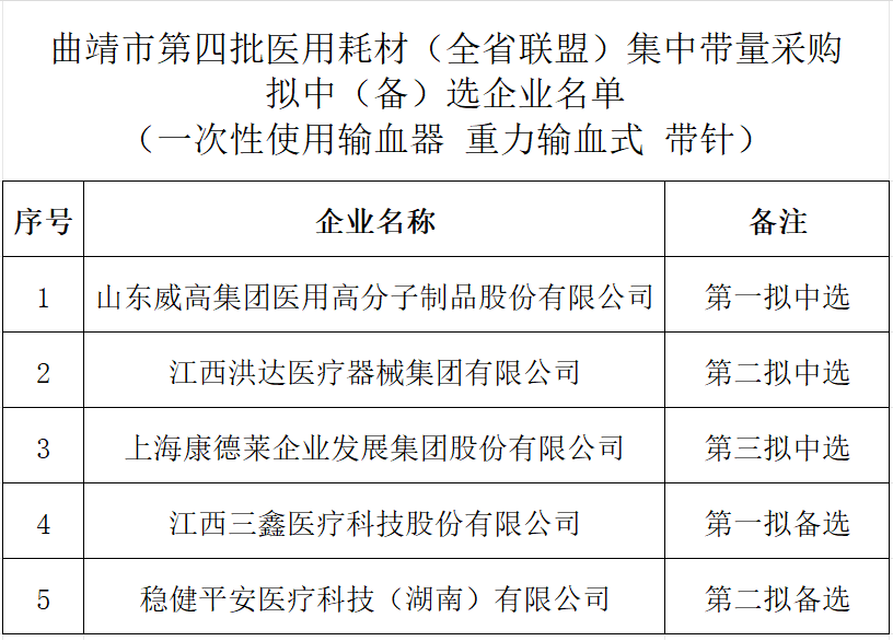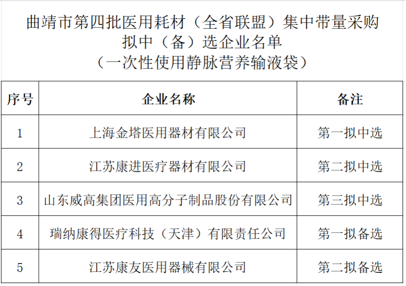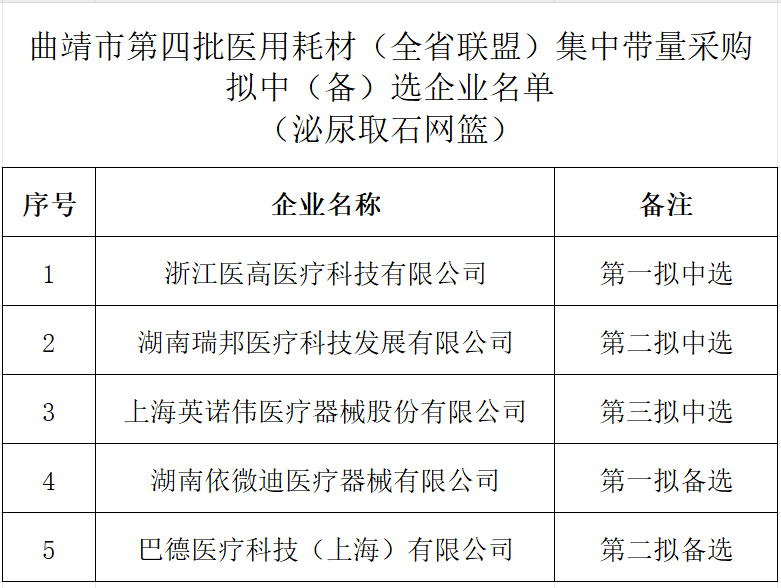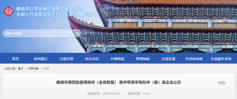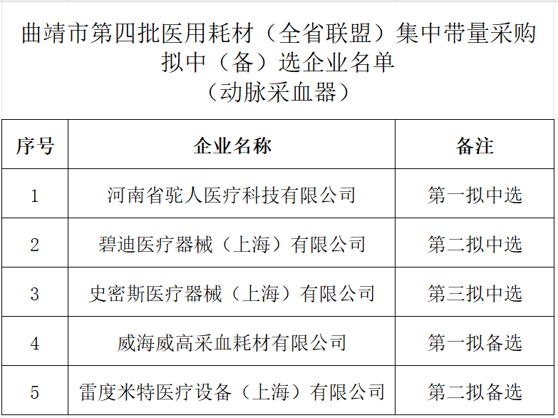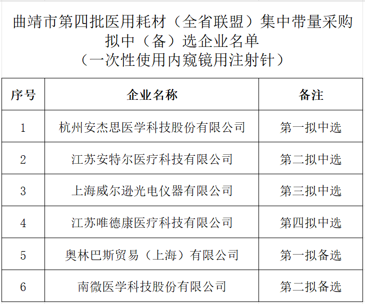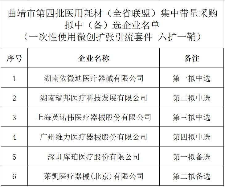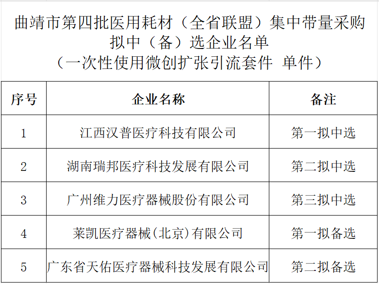 4月1日,云南曲靖市藥品和醫(yī)用耗材聯(lián)合采購辦公室發(fā)布《曲靖市第四批醫(yī)用耗材(全省聯(lián)盟) 集中帶量采購擬中(備)選企業(yè)公示》。