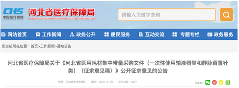 12月8日,據河北省醫(yī)保局消息,《河北省醫(yī)用耗材集中帶量采購文件(一次性使用輸液器類和靜脈留置針類)(征求意見稿)》當日發(fā)布,內容的核心為進一步降低醫(yī)用耗材虛高價格,規(guī)范醫(yī)療服務行為,保障臨床需求,減輕群眾就醫(yī)負擔。