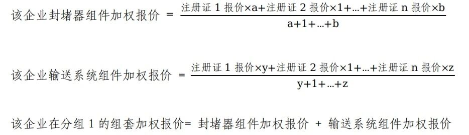 申報(bào)企業(yè)區(qū)分組別,按照注冊(cè)證分別進(jìn)行一輪報(bào)價(jià),同一分組內(nèi)一張注冊(cè)證報(bào)一個(gè)價(jià)格。注冊(cè)證報(bào)價(jià)同組套采購(gòu)模式一致,加權(quán)報(bào)價(jià)規(guī)則如下: