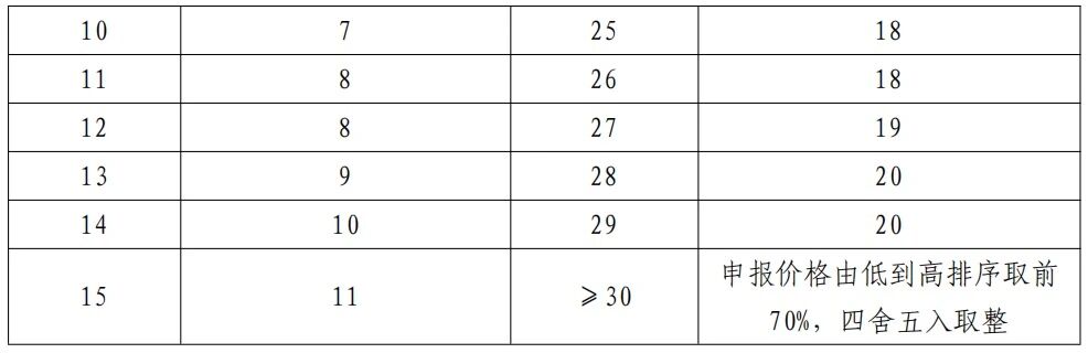 同一競(jìng)價(jià)單元內(nèi),依據(jù)申報(bào)企業(yè)報(bào)價(jià)由低到高進(jìn)行排名,按照擬中選企業(yè)取數(shù)表(下圖)確定擬中選企業(yè)。