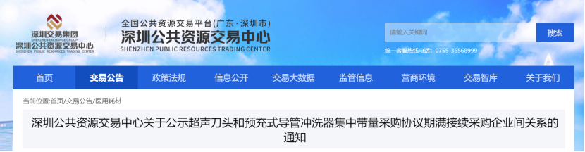 12月12日,深圳公共資源交易中心發(fā)布《深圳公共資源交易中心關于公示超聲刀頭和預充式導管沖洗器集中帶量采購協(xié)議期滿接續(xù)采購企業(yè)間關系的通知》(名單見文末),于2024年12月12日-2024年12月17日17:00進行公示。