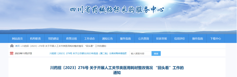 近日,四川省藥械招標(biāo)采購服務(wù)中心發(fā)布《川藥招〔2023〕276號 關(guān)于開展人工關(guān)節(jié)類醫(yī)用耗材整改情況 “回頭看”工作的通知》(以下簡稱《通知》)。