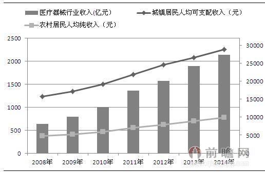 2008-2014年醫療器械行業收入與居民收入情況(單位:億元,元)