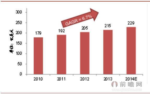 2010-2014年全球家用醫療器械市場規模(單位:億美元,%)