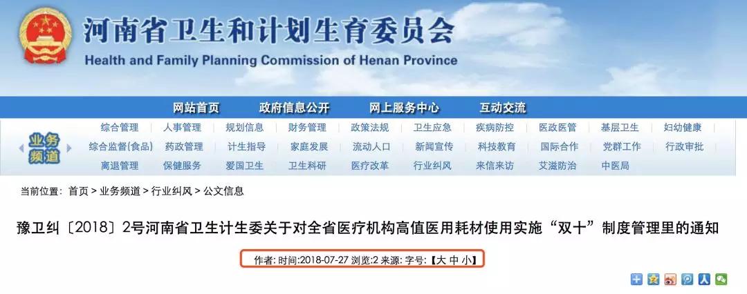 7月27日,河南省衛生和計劃生育委員會發布《關于對全省醫療機構高值醫用耗材使用實施“雙十”制度管理里的通知》,將全省耗材控費再升級,銷量兩次進入前10的,有可能會被停用,開單的醫生也將被上報到醫療糾風辦,在績效考核、職稱聘任、醫德醫風考評中受到影響。