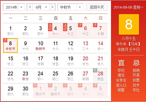 2014年北京華康普美科技有限公司,“秋季員工活動”從9月4日(星期四)下午-9月5日(星期五);“中秋節(jié)”假期為:9月6日(星期六)、9月7日(星期日)、9月8日(星期一)共放假3天,9月9日(星期二)正常上班。