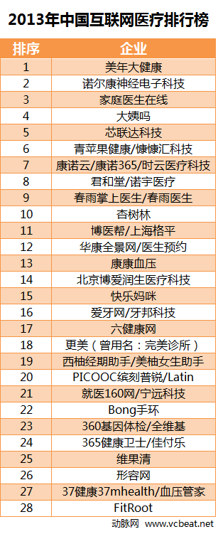 2013年有29家企業獲得融資,已公布融資額的有28家企業,總融資額為21186萬美元。主要還是覆蓋了移動醫療應用、軟硬件結合、移動設備、健康應用、在線社區等多個領域的企業。本榜單中,融資額最高的為專注體檢預約服務的美年大健康,在9月份,拿到平安創新投資基金、凱輝私募股權投資基金、凱雷亞洲基金3億人民幣的B輪融資。其中排名前十的主要覆蓋移動醫療應用、健康應用領域、軟硬件結合領域。
