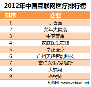 2012年有12家企業獲得融資,其中公布融資額的有9家,總融資額為4258.7萬美元。主要為覆蓋了移動醫療應用、遠程問診、預約掛號、健康應用、在線社區等領域的企業。本榜單中,融資額最高的為致力于醫藥及生命科學領域的社會化媒體平臺丁香園,在12月份,拿到順為基金、DCM數千萬美元的B輪融資。