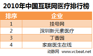 2010年有5家企業獲得融資,其中公布融資額的有4家,總融資額為2573.3萬美元。覆蓋了在線社區、門戶網站、移動醫療應用、醫院管理設備等領域的企業。本榜單中,融資額最高的又是掛號網領銜,在12月份,獲得風和投資、Cybernaut賽伯樂投資數千萬美元的B輪融資。
