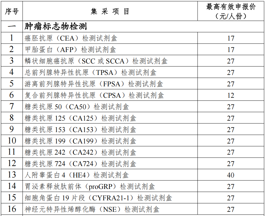此次集采周期兩年,品種包括腫瘤標志物檢測產品十六項(化學發光法、流式熒光法、時間分辨免疫熒光法等)與甲狀腺功能檢測產品九項(化學發光法),聯合檢測試劑不納入采購,具體品種及其最高有效申報價格如下: