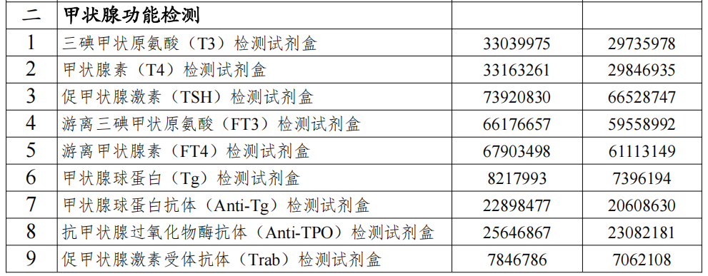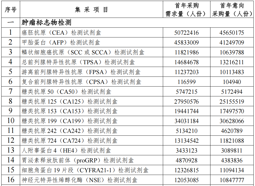 據統計,此次腫標檢測試劑意向采購量約為2.7億人份,首年意向采購量約為2.4億人份;甲功檢測試劑意向采購量約為3.3億人份,首年意向采購量為約3億人份。各集采項目具體情況如下:
