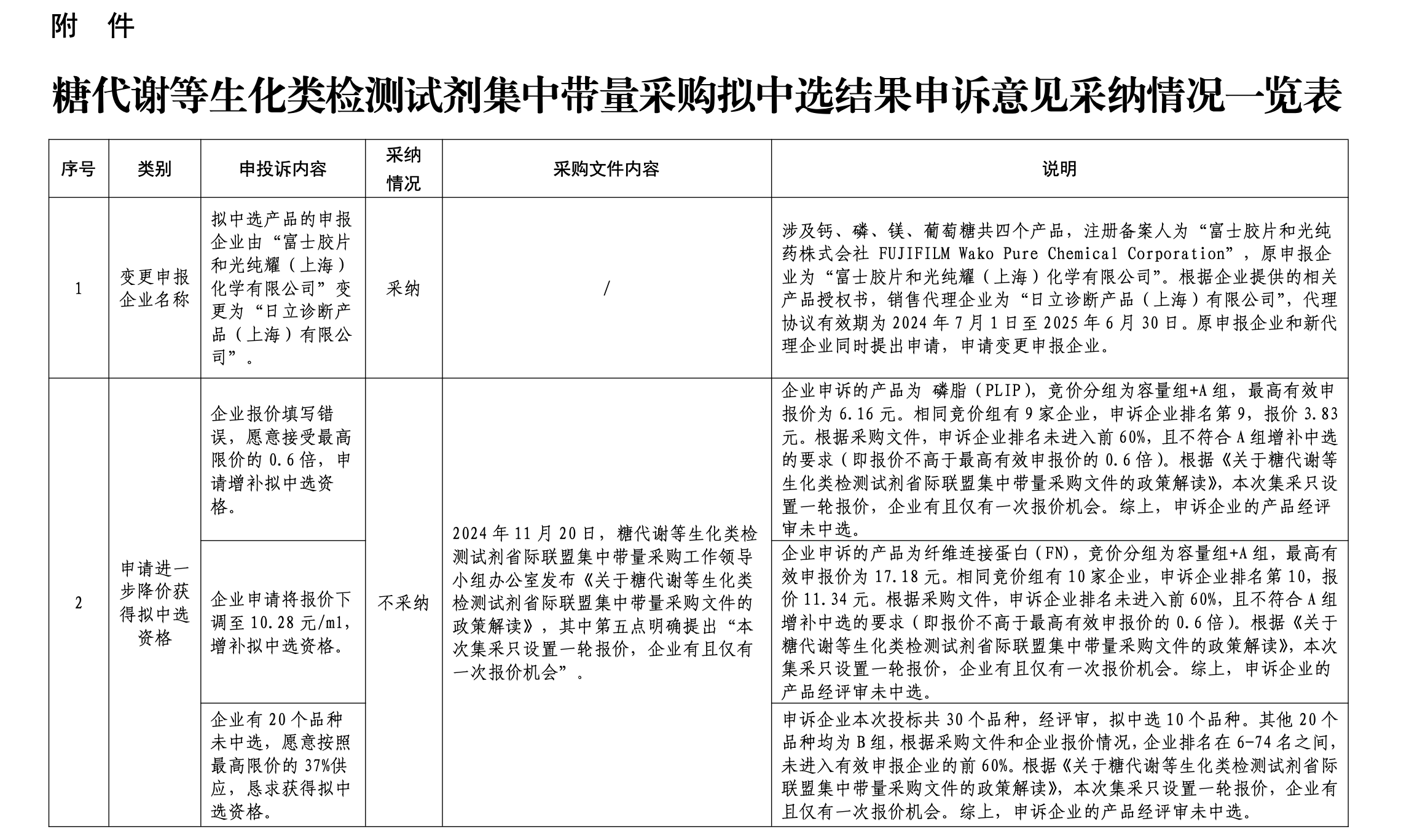 1月2日,江西醫(yī)保局發(fā)布《關(guān)于公布糖代謝等生化類檢測試劑省際聯(lián)盟集中帶量采購中選結(jié)果的通知》。同日,官方還對擬中選結(jié)果公示期間收到的申訴意見采納情況予以公開。