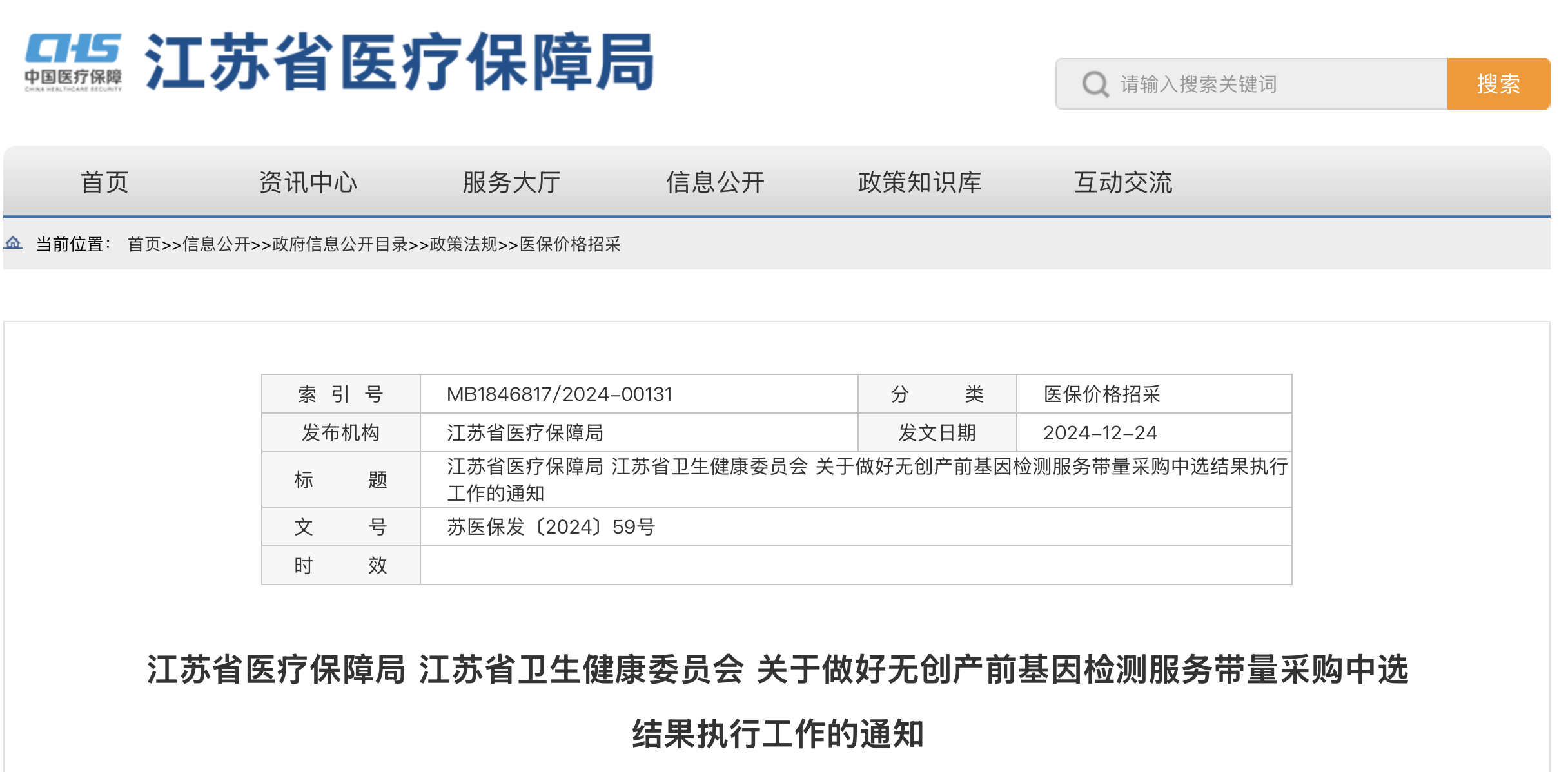 近日,江蘇醫(yī)保局發(fā)布《江蘇省醫(yī)療保障局江蘇省衛(wèi)生健康委員會 關(guān)于做好無創(chuàng)產(chǎn)前基因檢測服務(wù)帶量采購中選結(jié)果執(zhí)行工作的通知》,于2025年1月1日起執(zhí)行本次無創(chuàng)產(chǎn)前基因檢測服務(wù)帶量采購中選結(jié)果,執(zhí)行期暫定為2年。