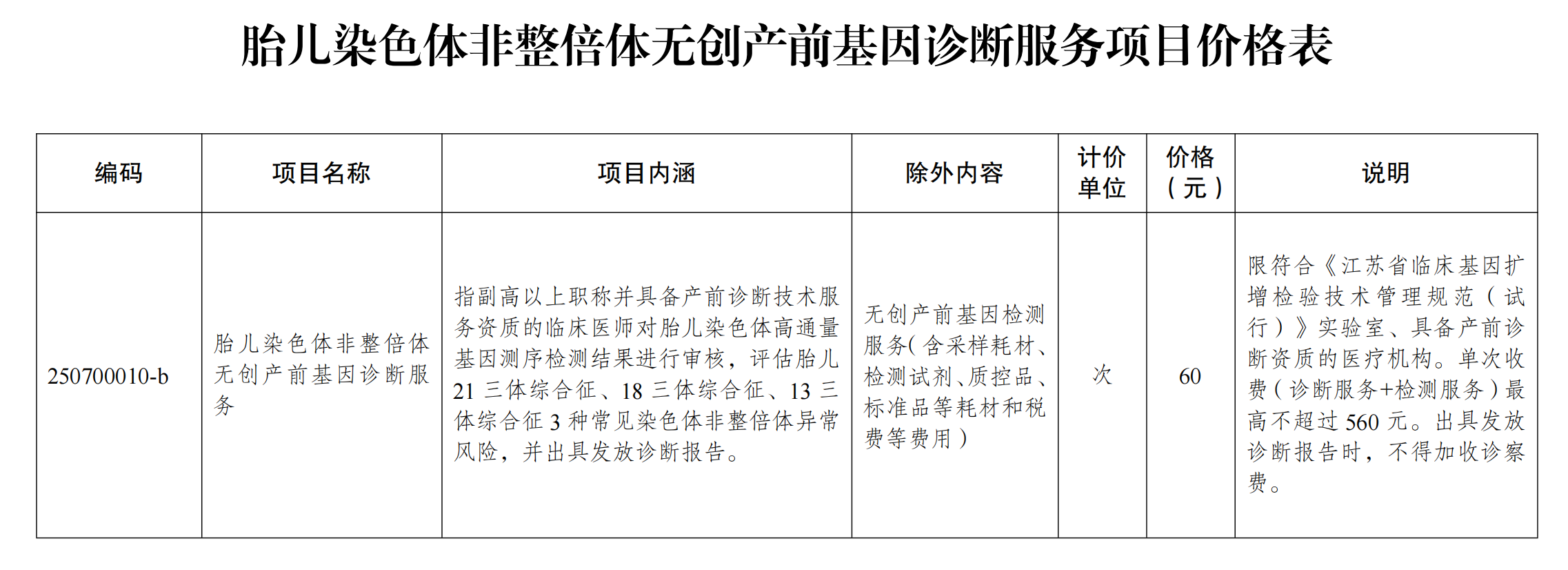 無創(chuàng)產(chǎn)前基因檢測按照“檢測服務(wù)+診斷服務(wù)”方式收取費(fèi)用,診斷服務(wù)最高政府指導(dǎo)價(jià)為60元/次,檢測服務(wù)按集采中選結(jié)果執(zhí)行,單次收費(fèi)最高不超過560元。醫(yī)療機(jī)構(gòu)出具診斷報(bào)告時(shí),不得再加收診察費(fèi)。省內(nèi)產(chǎn)前診斷機(jī)構(gòu)以及符合衛(wèi)生健康部門規(guī)定與產(chǎn)前診斷機(jī)構(gòu)建立合作機(jī)制的產(chǎn)前篩查機(jī)構(gòu),應(yīng)規(guī)范開展無創(chuàng)產(chǎn)前基因檢測服務(wù)并收取費(fèi)用。