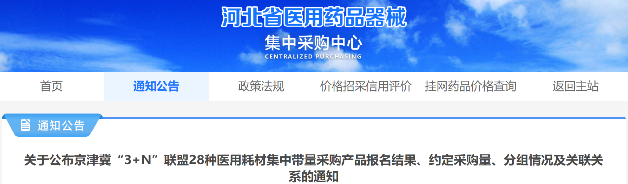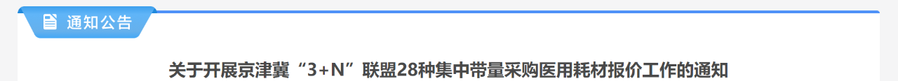 1月23日,河北省醫用藥品器械集中采購中心發布《關于公布京津冀“3+N”聯盟28種醫用耗材集中帶量采購產品報名結果、約定采購量、分組情況及關聯關系的通知》、《關于開展京津冀“3+N”聯盟28種集中帶量采購醫用耗材報價工作的通知》。