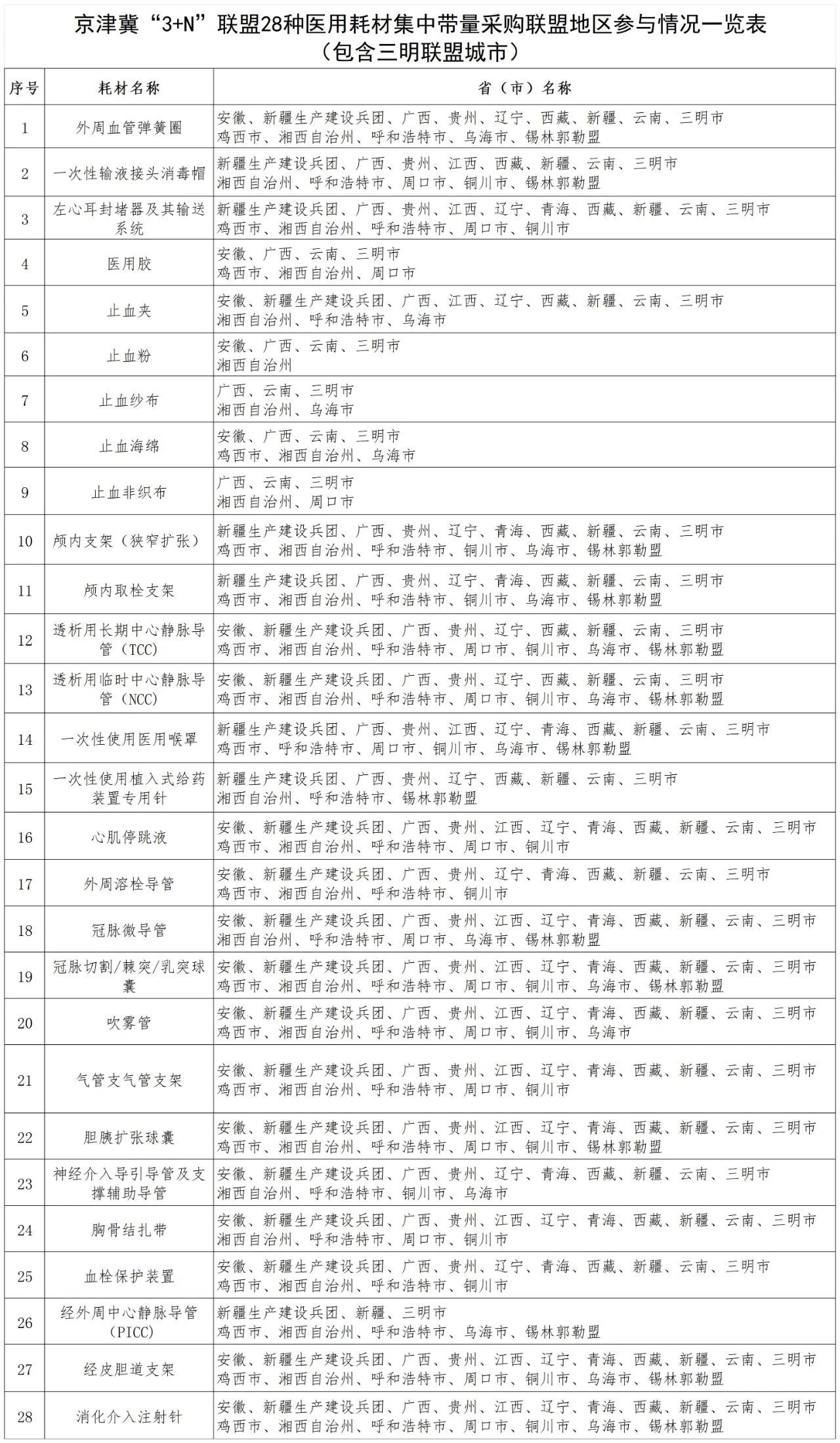 2023年12月28日,福建省三明聯盟城市官宣加入京津冀“3+N”聯盟28種醫用耗材集采,現階段聯盟地區一覽表如下: