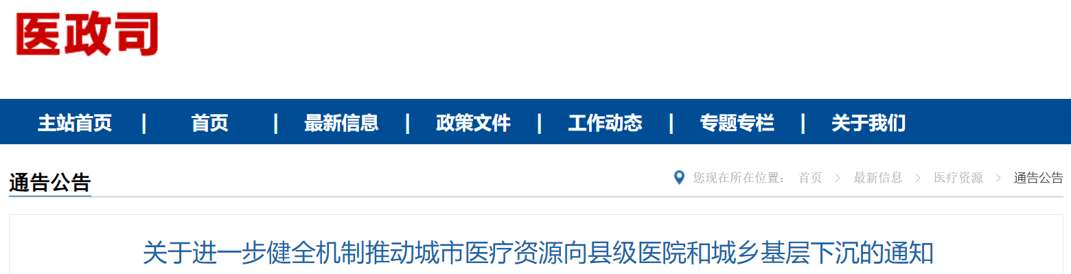 近日,國(guó)家衛(wèi)健委發(fā)布《關(guān)于進(jìn)一步健全機(jī)制推動(dòng)城市醫(yī)療資源向縣級(jí)醫(yī)院和城鄉(xiāng)基層下沉的通知》(完整附文末)。