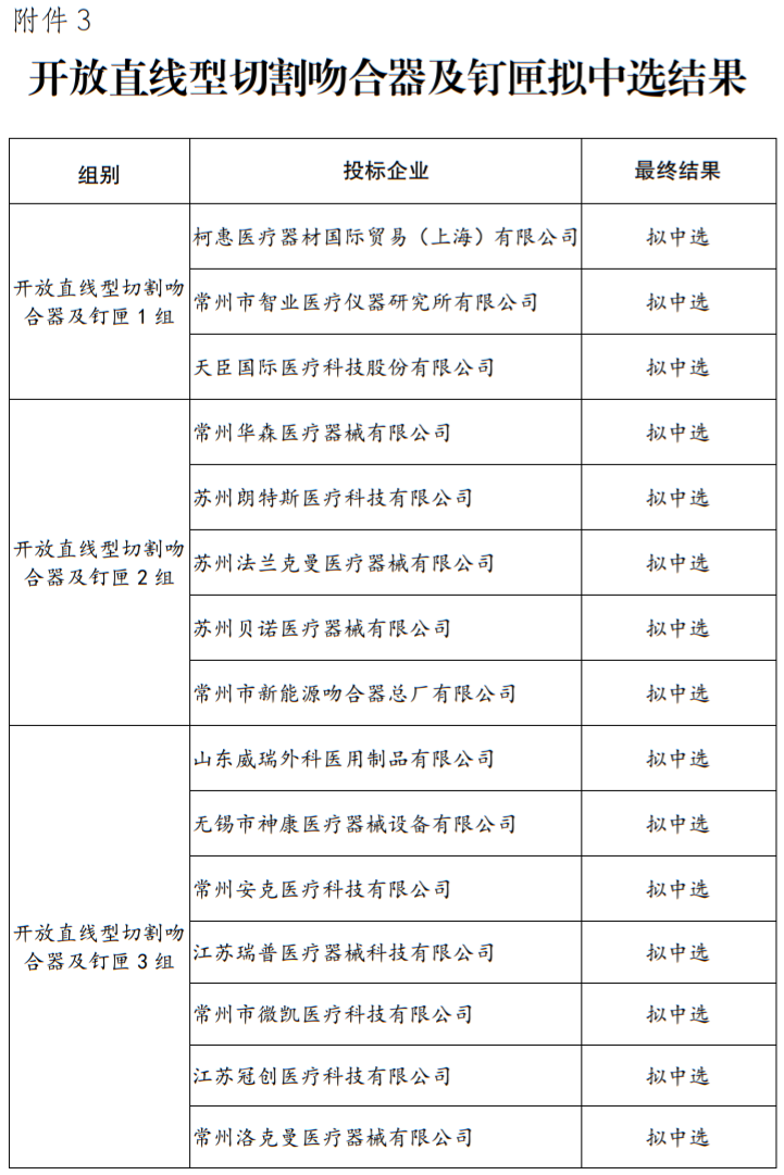 開放直線型切割吻合器及釘匣擬中選械企包括柯惠醫(yī)療、常州華森、蘇州朗特斯等;