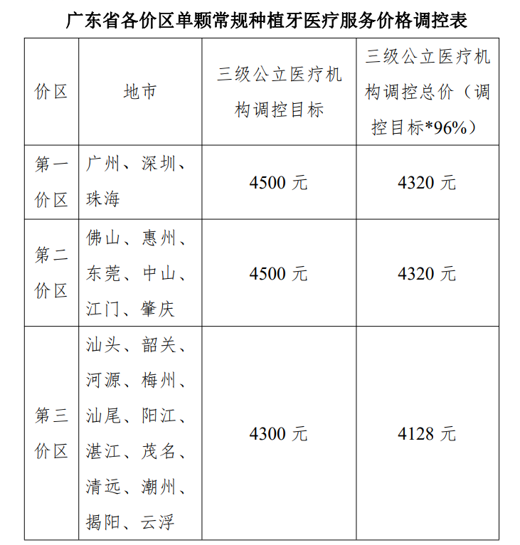 例如,廣東省制定口腔種植類醫(yī)療服務(wù)價(jià)格項(xiàng)目基準(zhǔn)價(jià),將全省21個(gè)地市分為3個(gè)價(jià)區(qū),基準(zhǔn)價(jià)為第二價(jià)區(qū)最高指導(dǎo)價(jià)(允許放寬情形除外),第一價(jià)區(qū)可在規(guī)定的基準(zhǔn)價(jià)基礎(chǔ)上適當(dāng)上浮5%-20%,第二價(jià)區(qū)可下浮,第三價(jià)區(qū)至少下浮5%。