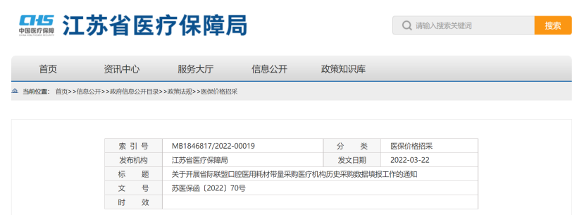 3月22日,江蘇省醫(yī)保局發(fā)布《關(guān)于開展省際聯(lián)盟口腔醫(yī)用耗材帶量采購醫(yī)療機構(gòu)歷史采購數(shù)據(jù)填報工作的通知》,根據(jù)國家醫(yī)保局總體部署,將參加省際聯(lián)盟對口腔種植體系統(tǒng)開展帶量采購,現(xiàn)組織口腔醫(yī)用耗材歷史采購數(shù)據(jù)填報。