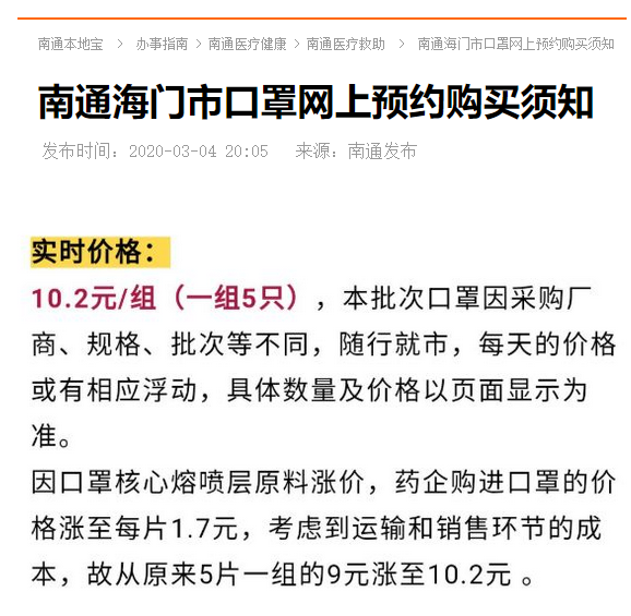 近日,南通本地寶轉發了南通發布一則通告:《南通海門市口罩網上預約購買須知》,由于口罩熔噴布價格的上漲,原本5片一組的口罩,由9元上漲至10.2元。價格上漲了13.3%。
