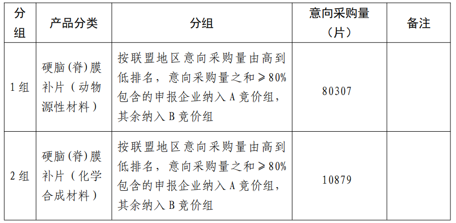 其中,硬腦(脊)膜補片根據材料不同形成2個分組,意向采購量共計91186片,具體如下: