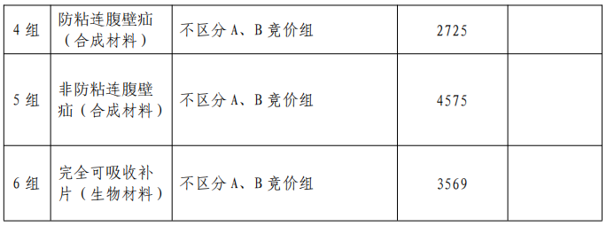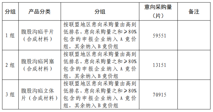 疝修補材料根據材料、修補部位、術式相關形成6個競價組,意向采購量共計154486片,具體如下: