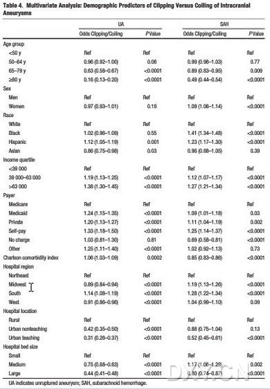 研究結果表明:當對比進行SAH治療的患者時發現,進行未破裂顱內動脈瘤治療者女性居多(75.0% 對比69.0%; P<0.0001)。總的,9.7%接受SAH治療的是自費患者,而3%進行未破裂動脈瘤治療的是自費患者(P<0.0001);62.2%接受SAH治療的是白種人,而76.4%進行未破裂顱內動脈瘤治療的是白種人(P<0.0001);黑人、拉美裔和亞洲患者在接受SAH治療組中所占比例較高,相對而言,在未破裂顱內動脈瘤治療組中所占比例較低(他們的P<0.0001)
