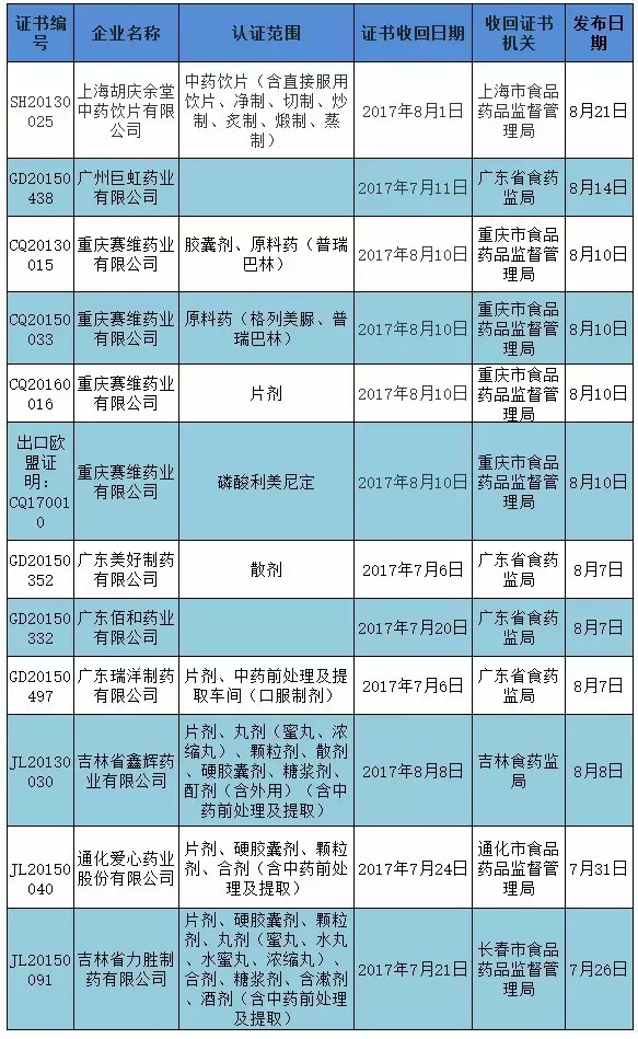 8月21日,上海市食藥監(jiān)局發(fā)布《收回藥品GMP證書(shū)公告(2017年第1號(hào))》。