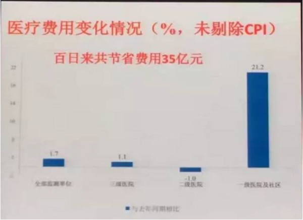 100天中,平均住院時(shí)間減少了1.6天。雷海潮介紹說(shuō),3月份,北京地區(qū)平均住院時(shí)間為8.1天,目前已穩(wěn)定在6.5天。“如果沒(méi)有改革舉措,大約需要10年的時(shí)間平均住院率才能縮短1.6天。住院率的縮短有助于加強(qiáng)三級(jí)醫(yī)院重視疑難重癥處置和改善住院醫(yī)療服務(wù)”。