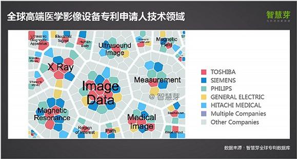 3)高端醫(yī)療影像設(shè)備的專利量,全球前五名的企業(yè)分別為:東芝,通用電氣,西門子,飛利浦和日立公司。