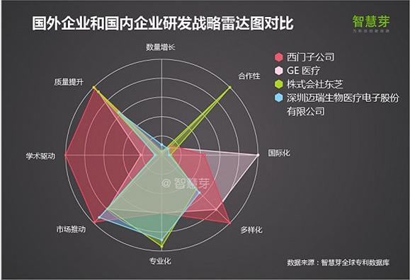 本次分析中我們以深圳邁瑞公司為例,對(duì)比國(guó)內(nèi)企業(yè)與國(guó)外“三巨頭”德國(guó)西門子,美國(guó)通用和日本東芝公司在高端影像醫(yī)學(xué)設(shè)備領(lǐng)域的專利的多項(xiàng)指標(biāo)進(jìn)行對(duì)比,從而挖掘出國(guó)內(nèi)企業(yè)和國(guó)外巨頭相比,在研發(fā)策略上的異同。