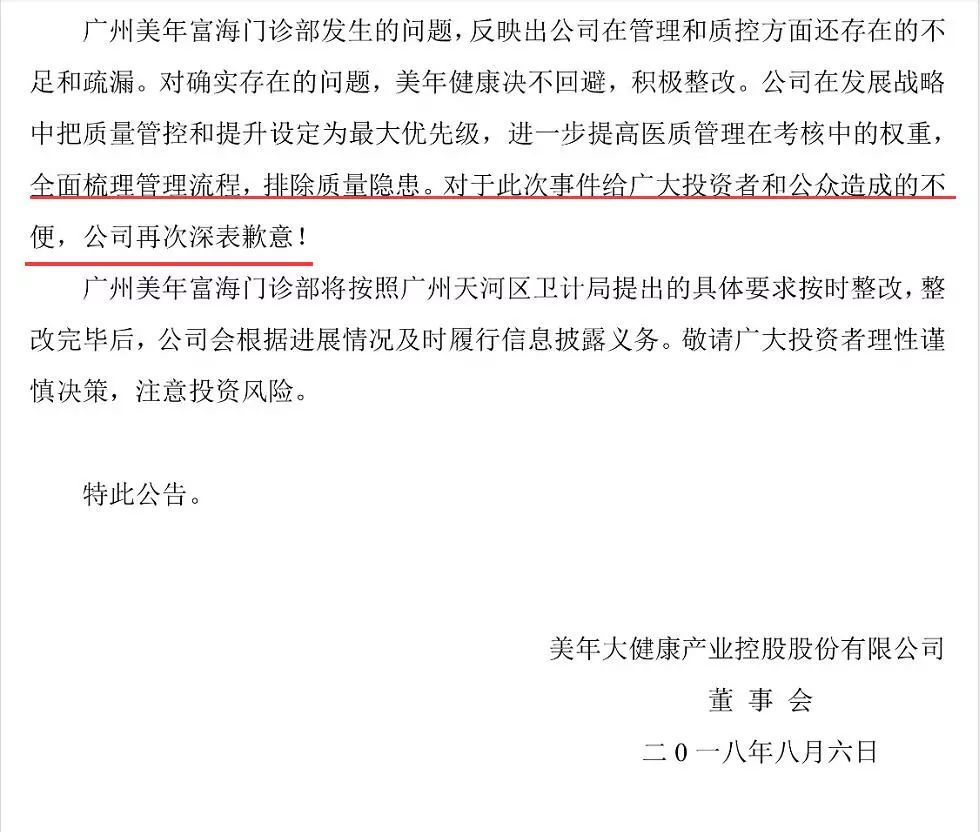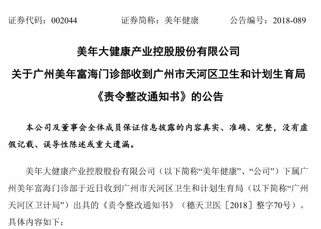 美年健康在8月5日晚的公告中表示,在收到《責(zé)令整改通知書》后,第一時(shí)間派駐專項(xiàng)工作小組進(jìn)駐廣州美年富海門診部,進(jìn)行深度調(diào)查,并逐步落實(shí)整改。