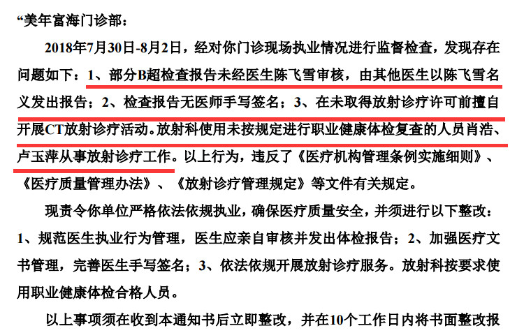 8月5日晚,美年健康發(fā)布公告,廣州美年富海門診部收到廣州市天河區(qū)衛(wèi)生和計(jì)劃生育局《責(zé)令整改通知書》,證實(shí)了美年健康美年富海門診部存在冒名醫(yī)生、體檢報(bào)告無醫(yī)師手寫簽名、違規(guī)開展CT放射診療活動等三大違規(guī)行為:
