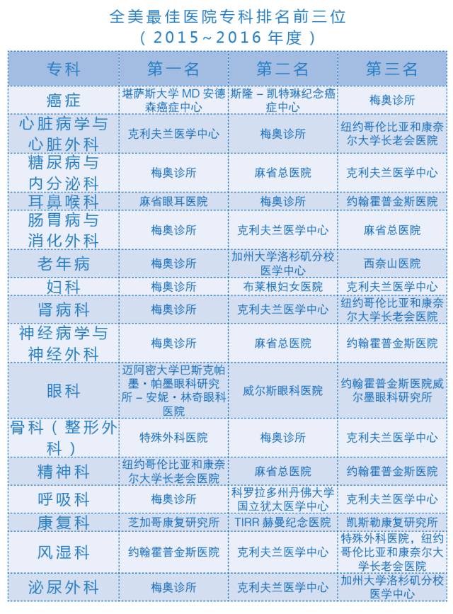 2015年全美最佳醫院排行榜Top15:專科強才是真的強!