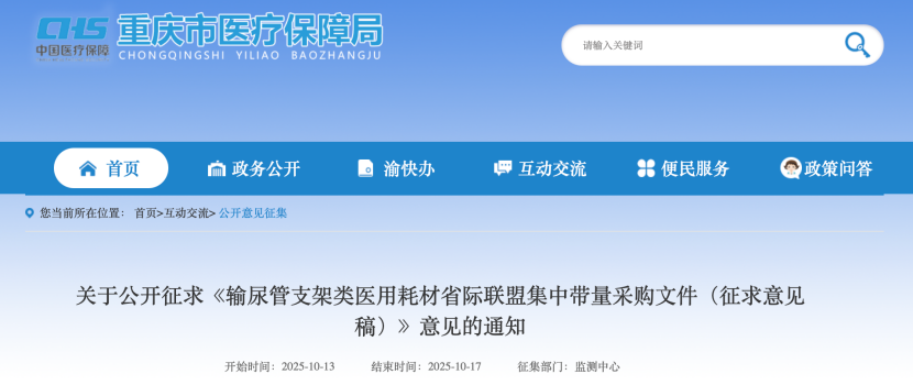 10月13日,重慶醫(yī)保局發(fā)布《關于公開征求<輸尿管支架類醫(yī)用耗材省際聯(lián)盟集中帶量采購文件(征求意見稿)>意見的通知》(以下簡稱《征求意見稿》)。