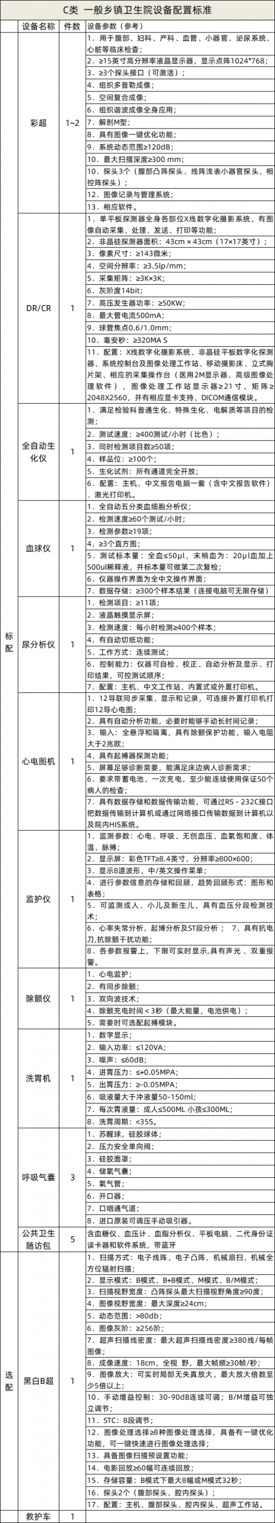 縣級醫院對醫療設備的需求大致如此。鄉鎮衛生院目前的設備配置標準,我們可以參考一下浙江省: