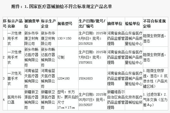 (一)手術(shù)衣3家企業(yè)3批次產(chǎn)品。新鄉(xiāng)市華康衛(wèi)材有限公司、新鄉(xiāng)市暢達(dá)醫(yī)療器械有限公司生產(chǎn)的各1批次一次性使用手術(shù)衣,〔阻微生物穿透,濕態(tài)〕不符合標(biāo)準(zhǔn)規(guī)定;河南省藍(lán)天醫(yī)療器械有限公司生產(chǎn)的1批次一次性無(wú)菌手術(shù)衣,〔阻微生物穿透,濕態(tài)〕、抗?jié)B水性(產(chǎn)品關(guān)鍵區(qū)域)不符合標(biāo)準(zhǔn)規(guī)定。