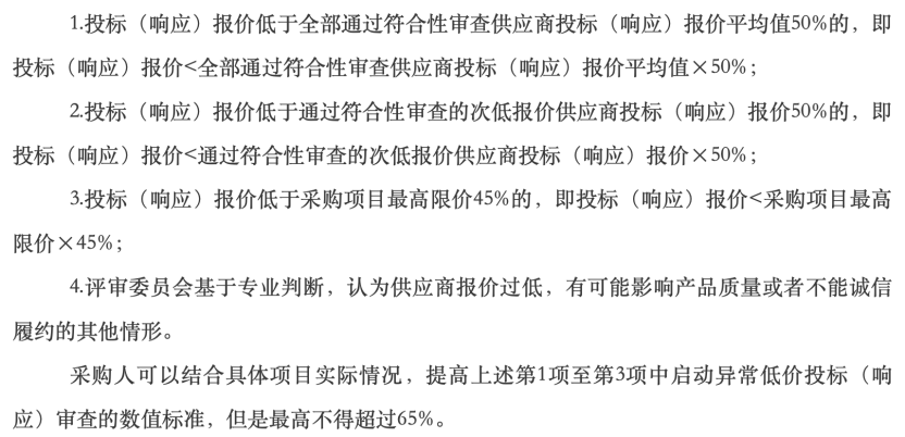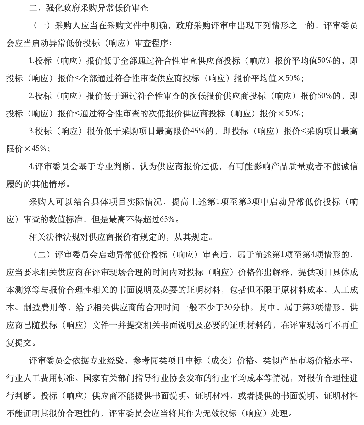 據(jù)觀察,其中加強(qiáng)了政府采購需求管理,同時(shí)明確要強(qiáng)化政府采購異常低價(jià)審查。