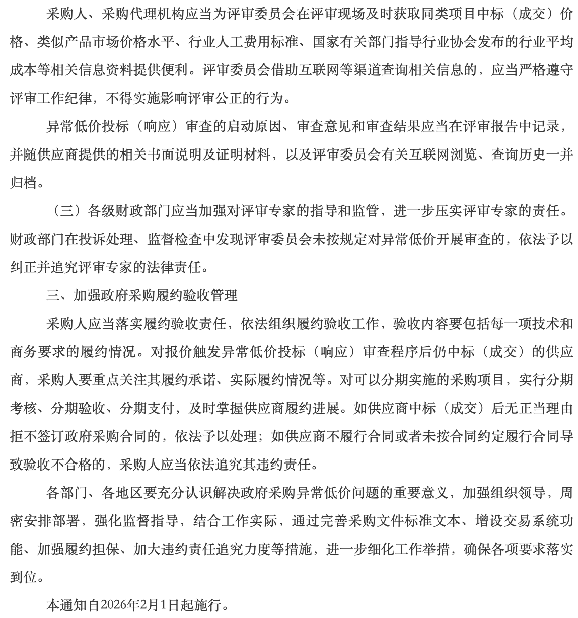 近日,財(cái)政部發(fā)布《關(guān)于推動(dòng)解決政府采購異常低價(jià)問題的通知》(以下簡稱《通知》,附文末),其中顯示,為整治政府采購領(lǐng)域“內(nèi)卷式”競爭,形成優(yōu)質(zhì)優(yōu)價(jià)、良性競爭的市場秩序,現(xiàn)就推動(dòng)解決政府采購異常低價(jià)問題有關(guān)事項(xiàng)通知,該文件自2026年2月1日起施行。